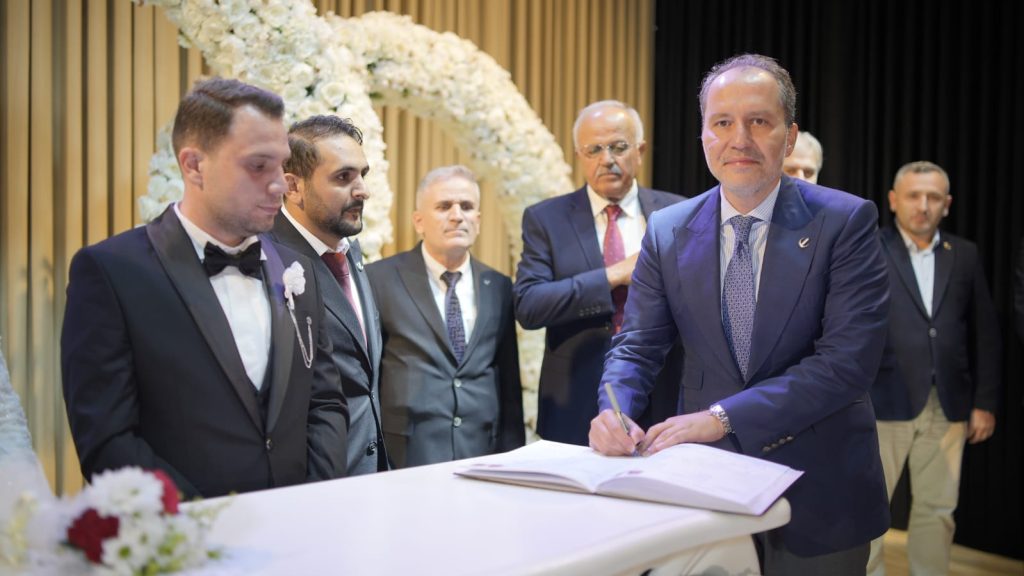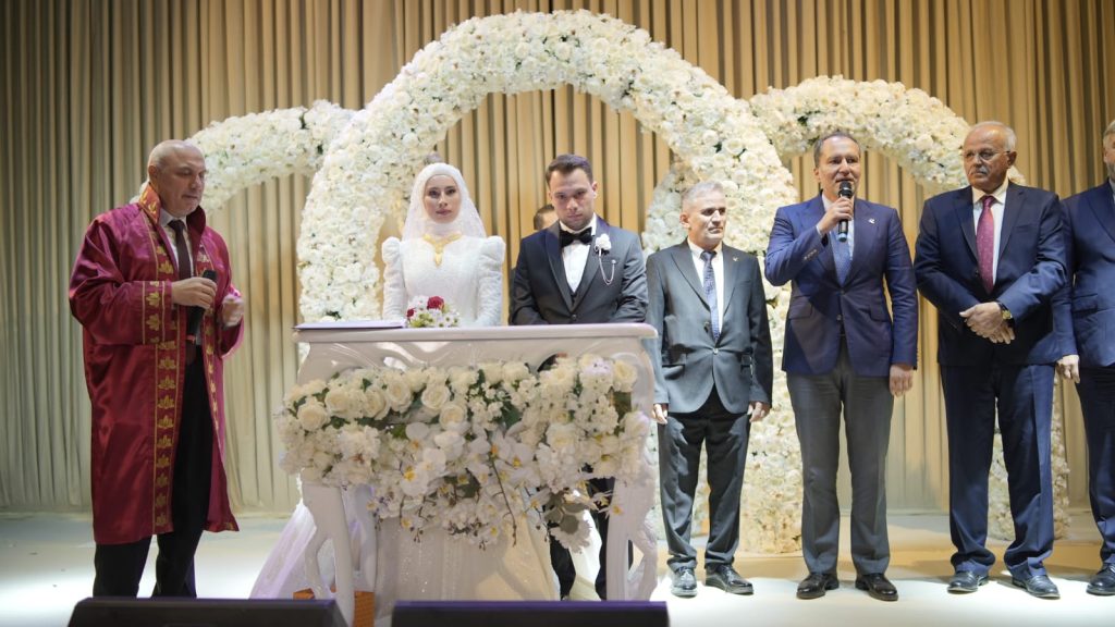 Genç çiftin nikâh şahitliğini, Yeniden Refah Partisi Genel Başkanı Dr. Fatih Erbakan yaptı. Erbakan’ın imzasıyla taçlanan bu özel an, davetliler tarafından büyük alkış aldı. Nikâh töreni, sadece aileler için değil, siyasetin kalbindeki isimler için de unutulmaz bir buluşma oldu.